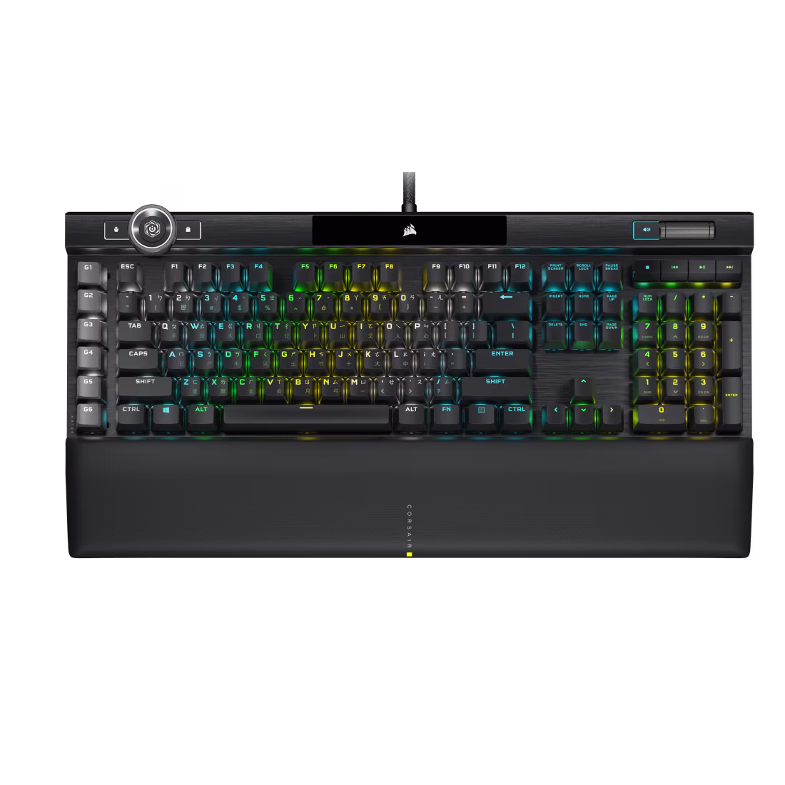 • Rueda de Control iCUE: Situada en la esquina superior izquierda, es una rueda multifunción programable para ajustar el brillo, el zoom o funciones personalizadas en juegos y aplicaciones.